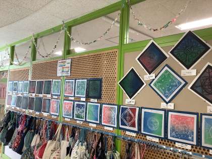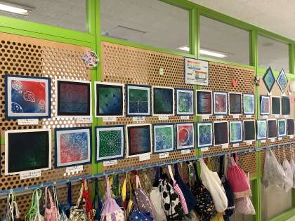 割り箸やくしを使って、スチレンボードにへこみを付け、ローラーでインクを付けて刷りました。