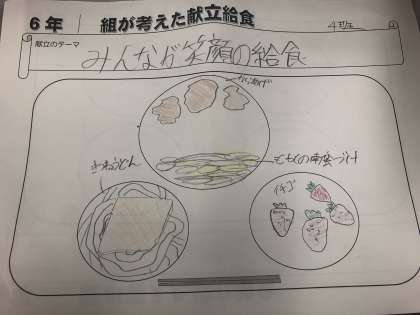 今日の給食は、6年1組の作成献立です。テーマは、「みんなが笑顔の給食」です。(実際の給食では、栄養士が細かい部分を修正しています)