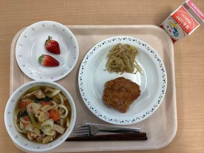 「きつねうどんの『きつね』は、うどんの中の油揚げを指しています。また、なぜ『油揚げ』を『きつね』というかというと、昔は、油揚げが狐の好物として考えられていたからです。果物のいちごは、ハウス栽培のものは今が旬です。ぜひ、味わってください。」