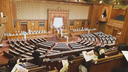 本会議場の傍聴席に座り、国会議事堂の説明を受けました。