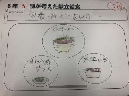 今日の給食は、6年5組の作成献立です。テーマは、「栄養満点でおいCー」です。(実際の給食では、栄養士が細かい部分を修正しています。)