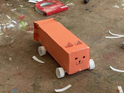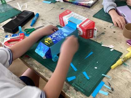 牛乳パック、ペットボトルのキャップ、竹ひご、ストローを材料にして牛乳パックカーを作りました。牛乳パックの使い方は人それぞれで、1つの牛乳パックを細工している子もいれば、いくつかの牛乳パックを連結して使っている子もいました。