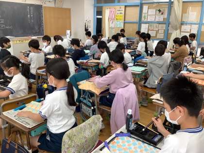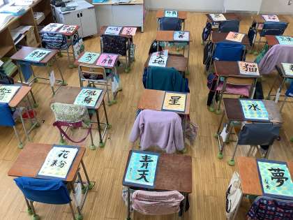 子供たちが半紙に書いた漢字と染めた色が合っていて、みんなの作品を並べるととてもすてきでした。