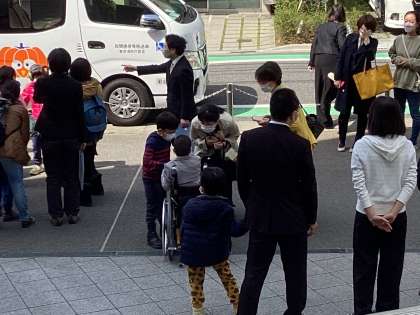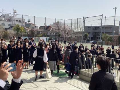第1部の卒業生が学級指導を終え、大階段から校庭に降りてきました。たくさんの先生方、保護者の方から温かい拍手をもらっていました。きはだ学級の卒業生は毎日の登校を支えてくれたパンプキン号の前でのお別れです。