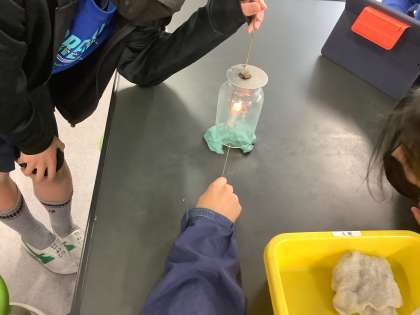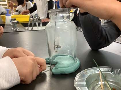 集気びんの中に入れたろうそくが燃えている時の空気の動き方の観察を行いました。