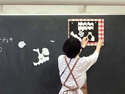 先生から台紙に紙を貼るときの糊の使い方も教わって、切った模様をどのように台紙に貼るのかを各自考えていました。