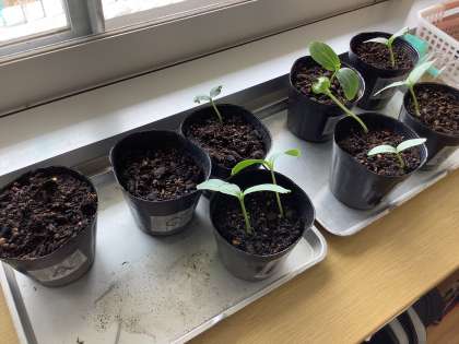 5/2 早く芽を出せ 4年生 公開日 2022/05/02 更新日 2022/05/02 できごと 4月19日にヘチマの種をまきました。 教室の窓際に置いて さるかに合戦のかにのように集まって 芽が出るのを待ちました。 今朝見てみると、全部のグループのポットに 芽が出ていました。 もうしばらく教室で育ててから ビオトープに植え替えます。 一粒からいくつの実ができるのか 楽しみです。 いいね(0)