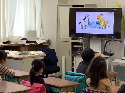 イソップ童話に出てくる「きつねとつる」の話を通し、自分のことだけでなく、相手のことも考えて行動することの大切さについて話がありました。