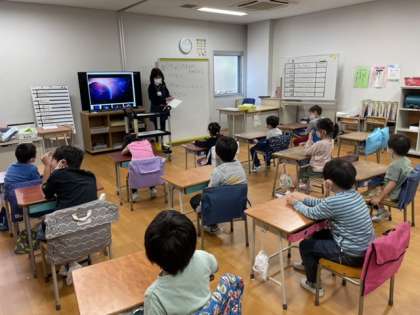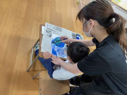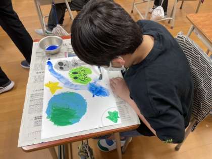 低学年はクレパス、高学年は色鉛筆で地球や惑星に色を塗り、空いているところには宇宙に関する絵を自由に描きました。ロケット、宇宙飛行士、宇宙人にUFOなど、それぞれ愉快な宇宙の様子を表現できました。最後は青や緑の絵の具で周りを塗って、完成できました。