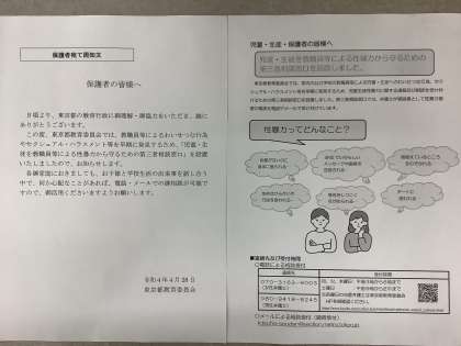 この度、東京都教育委員会では、教職員等によるわいせつな行為やセクシュアル・ハラスメント等を早期に発見するため、「児童・生徒を教職員等による性暴力から守るための第三者相談窓口」を設置いたしましたので、お知らせします。