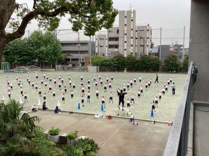 体育学習発表会まであと2週間。学年みんなで校庭に出て、ダンスを踊りました。