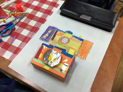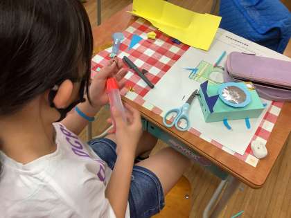 お家からもってきた空箱に画用紙で様々な機能を付けてカメラを作っていました。
