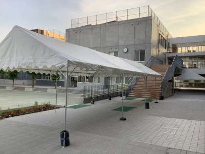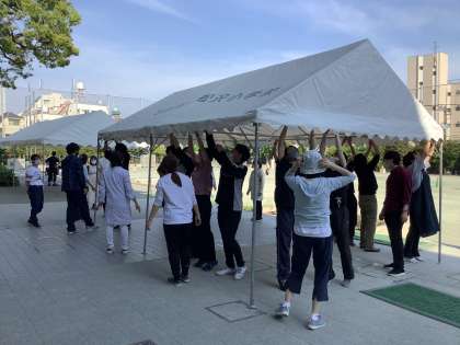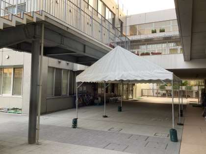 職員総出で、保健室前と大階段前に3つのテントを設置しました。