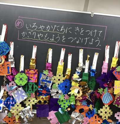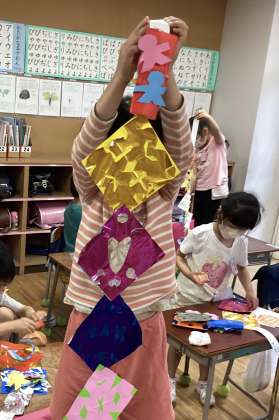 折りたたんだ色紙に、はさみで切り込みを入れてひらくとすてきな模様がひろがる「切り紙遊び」をしました。たくさんつなげて素敵な飾りにして6月の学校公開期間中に展示します。