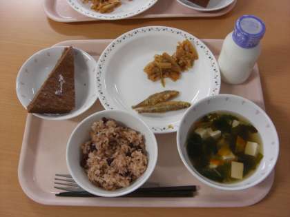 お赤飯、すまし汁、わかさぎのから揚げ、白菜のピリピリ、