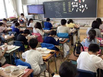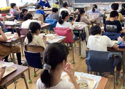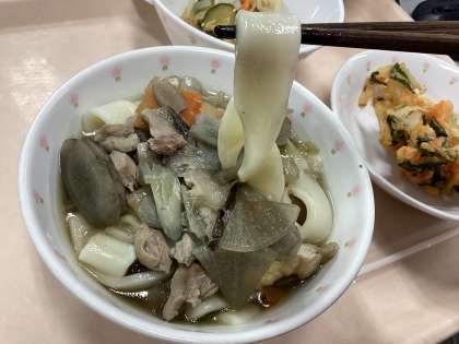 今月5年生が川場移動教室に行くので、群馬県の郷土料理である「おきりこみ」を作りました。群馬県は全国有数の小麦の産地です。その小麦の地粉で作ったひもかわを、地場産野菜たっぷりの鍋に「切っては入れ、切っては入れ」して煮込んで食べたことから、「おきりこみ」と呼ばれるようになりました。