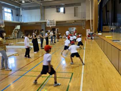今日は体育館で1年生と5、6年生が体力テストを行いました。行った種目は反復横跳び、立ち幅跳び、長座体前屈の3種目です。