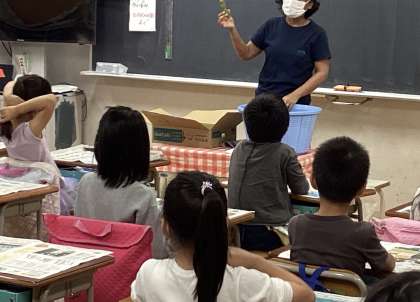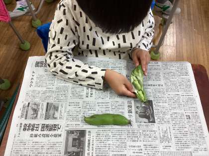 剥く前の鞘を見て「バナナみたい。」「毛が生えてる。」など、剥いた後は「(豆が)3つ入ってた。」「(鞘の)中がフワフワしている。」などの意見があり、いろいろな発見ができました。