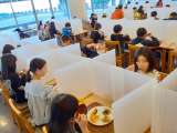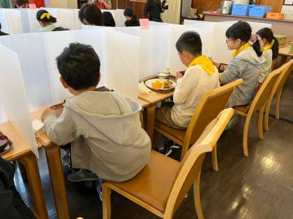 パーテーションに仕切られた食堂で班ごとにかたまっていただきました。