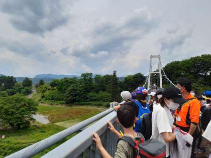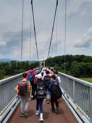 6/17 川場移動教室18 つり橋を渡りました 公開日 2022/06/17 更新日 2022/06/17 できごと カントリーガイドウォークもいよいよ終盤。 大きなつり橋の上から、川の流れや、川場村を囲む山々を眺めました。 田んぼアートが仕込まれているそうです。 どんな作品になるのでしょうか。 いいね(0)
