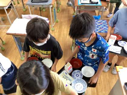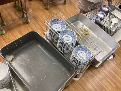 和食器は重く数も普段より多いので、配膳は大人が数名加わりますが、片付けは基本的に自分たちで行います。和食器体験のクラスは食べ残しが普段より大幅に減るので、食器数が多くても比較的スムーズに片付けることができます。月曜日から1クラスずつ実施した和食器体験も今日が最終日です。