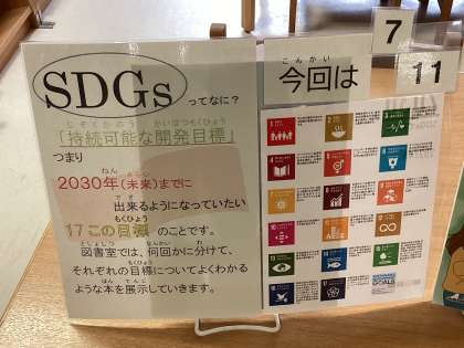 ふれあいルームと図書室では、SDGsのコーナーを作り、子供たちが気軽にSDGsの本を手に取れるように準備をしています。