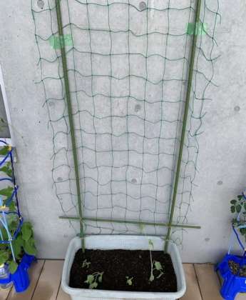 昨年度ビオトープで育てていたヘチマの種から芽が出た苗も植え、4つになりました。