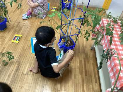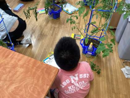 ミニトマトの観察です。暑いので、ミニトマトの鉢を教室内に持ち込み、観察を行いました。