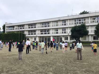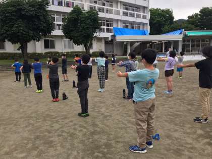 グラウンドでの朝会・体操を終え、これから食堂で朝ごはんを食べます。今日の午前は恩賜林庭園に行く予定です。