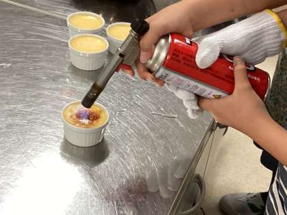 クリームブリュレを作るときには、表面にグラニュー糖を乗せてバーナーで炙る(キャラメリゼ)工程をさせてもらいました。バーナーの火の強さに緊張しながらも、美味しそうなクリームブリュレが出来上がりました。