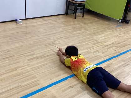 最初は立って的を狙っていましが、上手に命中するようになると、姿勢を変えて狙う子も出てきて、楽しんで遊ぶことができました。