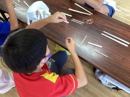 さすが4年生です。割りばしを輪ゴムで結ぶ位置や輪ゴムの巻き方に気を付けながら、順調に作業を進めます。完成した後には自分で段ボールにシールを貼って的を作り、的あてゲームをしました。