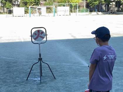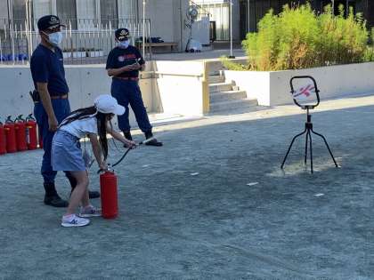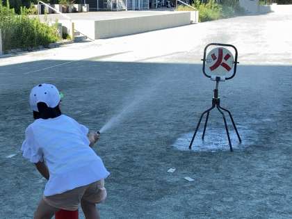 子供たちは緊張しながらも、「火」とか書かれた的めがけて上手に、水を発射していました。