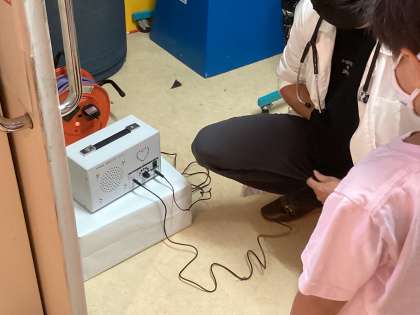 本校で飼育している3羽のウサギに加えて、獣医師の方に犬を持参いただき、触れ合いをしたり、ウサギや犬の心音を聴いたりしました。