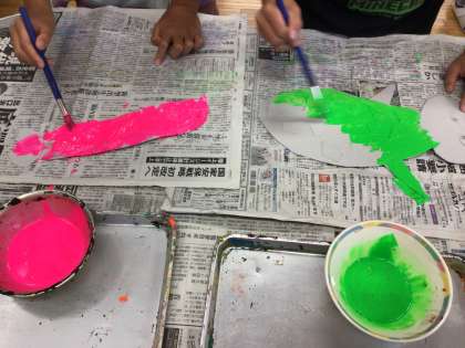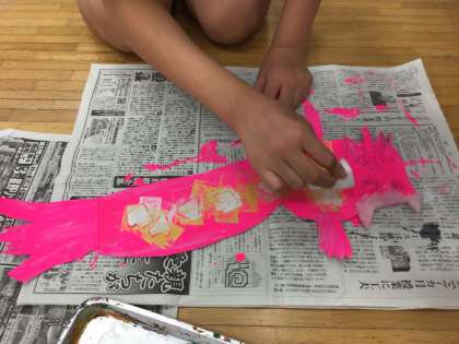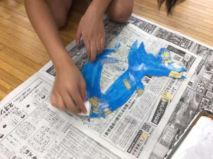 図工で「楽しい仲間たち」を作りました。まず、工作用紙を切ったり貼り重ねたりして凹凸のある生き物を作りました。その上に蛍光色、金、銀の絵の具を重ねて塗り、凹凸がより目立つようにして仕上げました。実際にいそうでいない、楽しい仲間たちがたくさんできました。