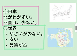 スーパーマーケットのチラシをみて、地図に生産地をまとめました。