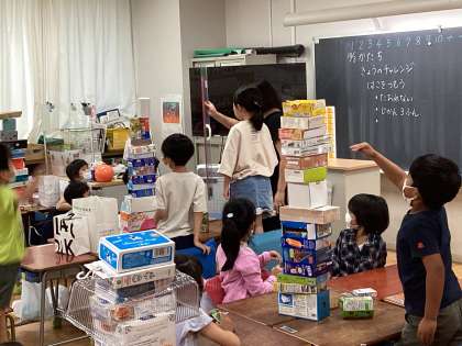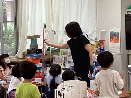10/3 かたちあそび 1年生 公開日 2022/10/03 更新日 2022/10/03 できごと 「たかくつもう」 家から持参した箱をグループで協力して高く積んでいきます。 ルールは2つ 1、時間は3分 2、倒れないように積む いろいろな形や大きさの箱があるので、積むのも大変です。 どの箱を下に置いたらいいか、バランスを考えながら積んでいきました。 いいね(0)