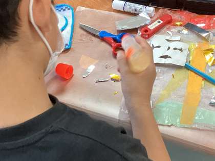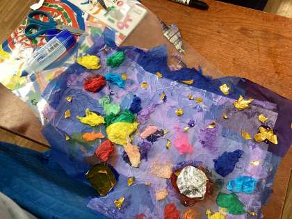 透明なシートにお花紙を貼り付けていき、いろんな模様を作っていきます。