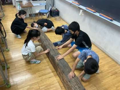 10/6 本物だぁ 4年生 公開日 2022/10/06 更新日 2022/10/06 できごと 社会で玉川上水の学習をしています。 教材室から茶色くて長くて重いものを みんなで運んできました。 なんと 本物の玉川上水の木樋(もくひ)です。 郷土博物館では見るだけでしたが 学校の物なので自由に触れます。 中がとても滑らかに削られていました。 400年前の技 すごいです。 いいね(0)