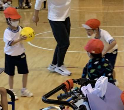 相手チームの攻撃が激しいと、10秒以内にパスするのは厳しいのですが、シュートして入ると「やったー!」と喜んでいました。