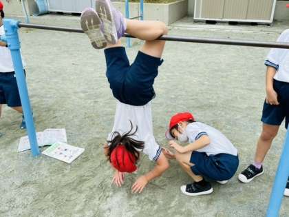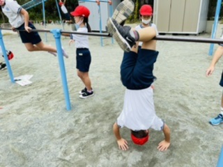 体が柔らかい児童が多く、鉄棒ではいろいろな技を披露していました。