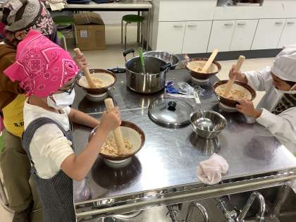10/13 味噌つくり きはだ学級 公開日 2022/10/13 更新日 2022/10/13 できごと 家庭科室では、きはだの児童が何やら一生けん命すり鉢でこねていました。 何を作っているかと聞いてみると「みそ」を作っているとのこと。 これから半年間ねかせる必要があるので、できあがるのは春です。 おいしい味噌ができるといいですね。 いいね(0)