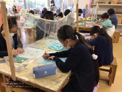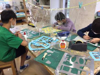 カッターを使って丁寧に切ったり、ボンドをムラなく塗って貼ったりして、オリジナルの盾を作っています。