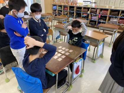 4年生が、初めて百人一首に触れる3年生に、歴史や遊び方の説明をしてくれました。