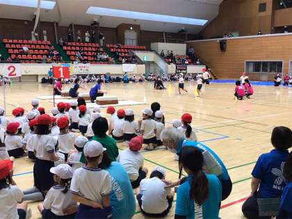 低学年は、ゴムひもを跳んだり跳び箱を渡ったりして競争しました。