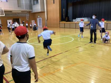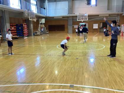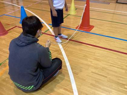 今日は体育館で大縄跳びです。高学年の子供たちはまず、小さい波を跳び越えることから始め、次に8の字跳びを挑戦しました。