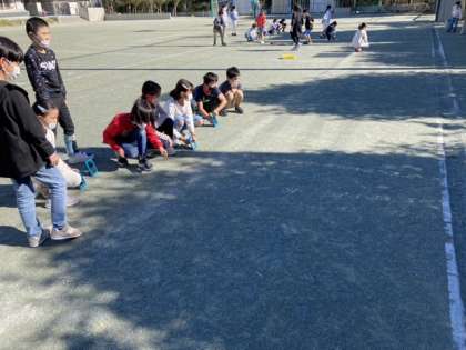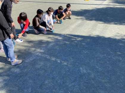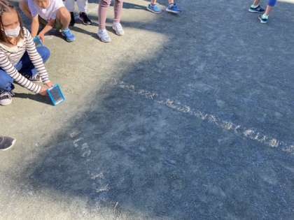 鏡で跳ね返した日光がどのように進むのか、実験しています。的に当てながら進み方を調べ、どう進むのか分かりました。