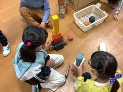 10/24 形遊び くすのき学級 公開日 2022/10/24 更新日 2022/10/24 できごと 算数では、形遊びの学習をしています。色々な形の積み木を触り、平な積み木の上に丸いボールを乗せると転がってしまうことが分かりました。ボール型、筒型、箱型、サイコロ型に仲間分けをすることができました。 いいね(0)