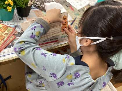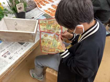 説明を聞いた後、すぐに作業開始。ハロウィン柄のペーパーナプキンをちぎって、鉢の側面に貼っていきます。子供たちはペーパーナプキンをちぎるのに一苦労。丁寧に自分が好きな模様の部分をちぎっていきました。