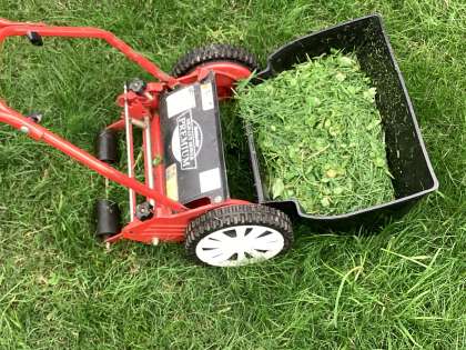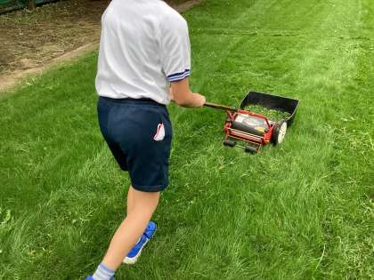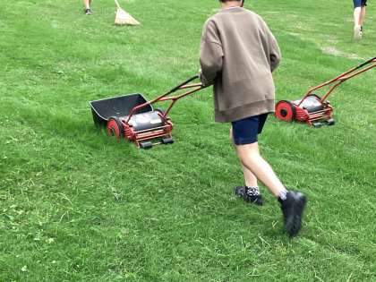 手動の芝刈り機を使って、子供たちが芝を刈り整えてくれました。次回の活動からは、この第2校庭で気持ちよくサッカーができますね。